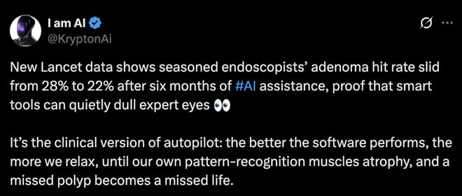 还有一位网友表示,这就像临床版的「自动驾驶」:软件表现越出色,我们就越放松,直到自己的「模式识别」能力逐渐退化,错过的息肉最终可能演变成错过的性命。
