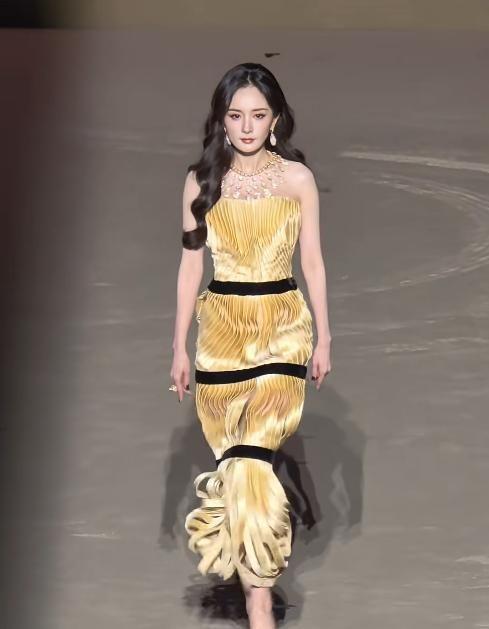 好在第二套金色鎏金拖尾长裙及时救场,远观确实流光溢彩、熠熠生辉,但拉近镜头后却被吐槽“头大身小如儿童玩偶”,比例失调问题暴露无遗。