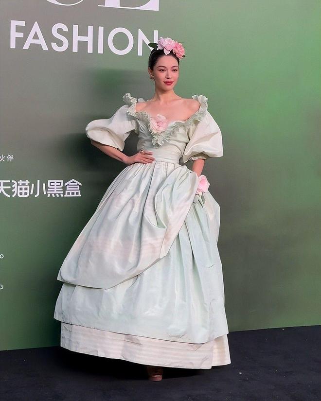 然而高耸的绿色发髻造型过于夸张,被调侃“刚从动画电影《史莱克》片场赶过来”,侧颜线条分明,又被形容为“金刚芭比穿上公主裙”,反差感强烈却不协调。