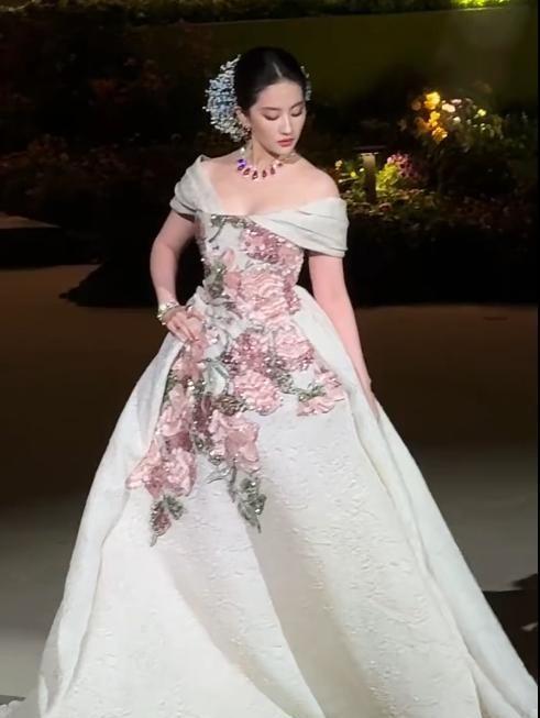 刘亦菲身着纯手工定制刺绣长裙登场,领口巧妙遮掩手臂线条,锁骨若隐若现,腰部剪裁贴合身形,完美勾勒出温婉与贵气并存的东方美人气质,宛如盛放于月光下的牡丹。